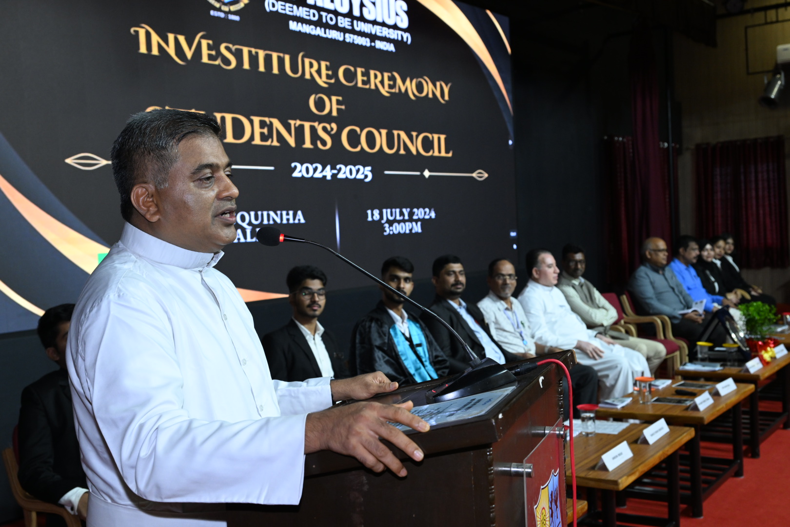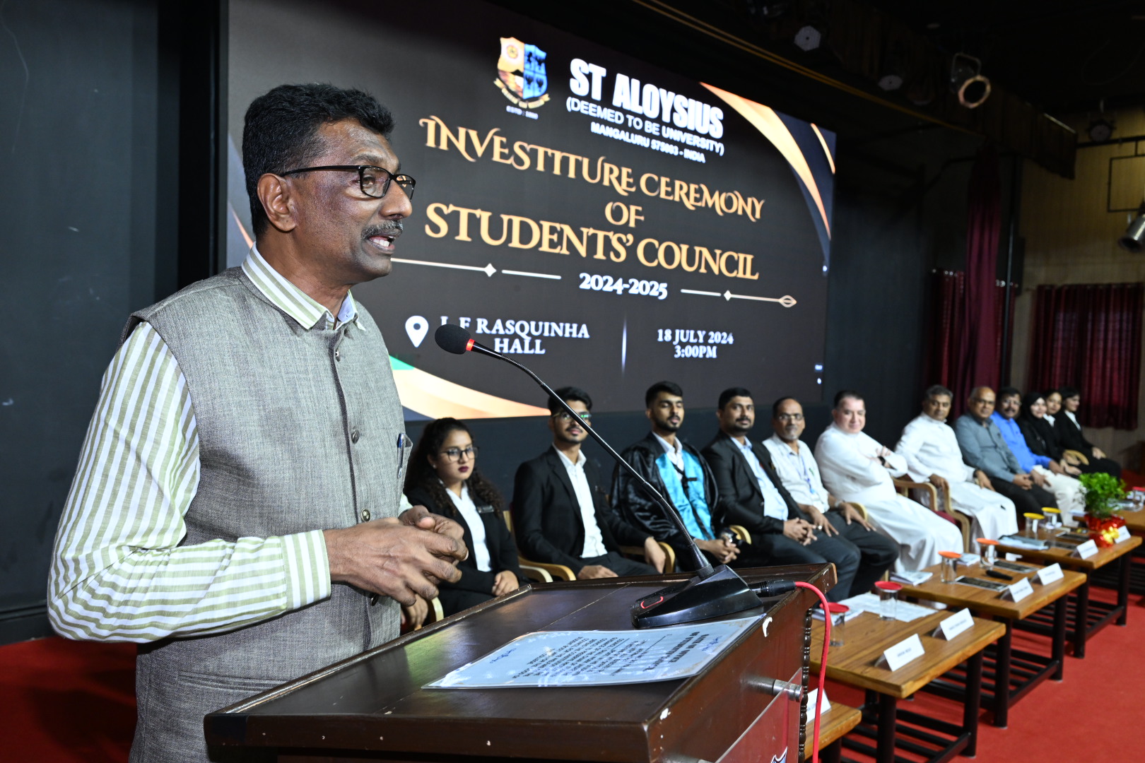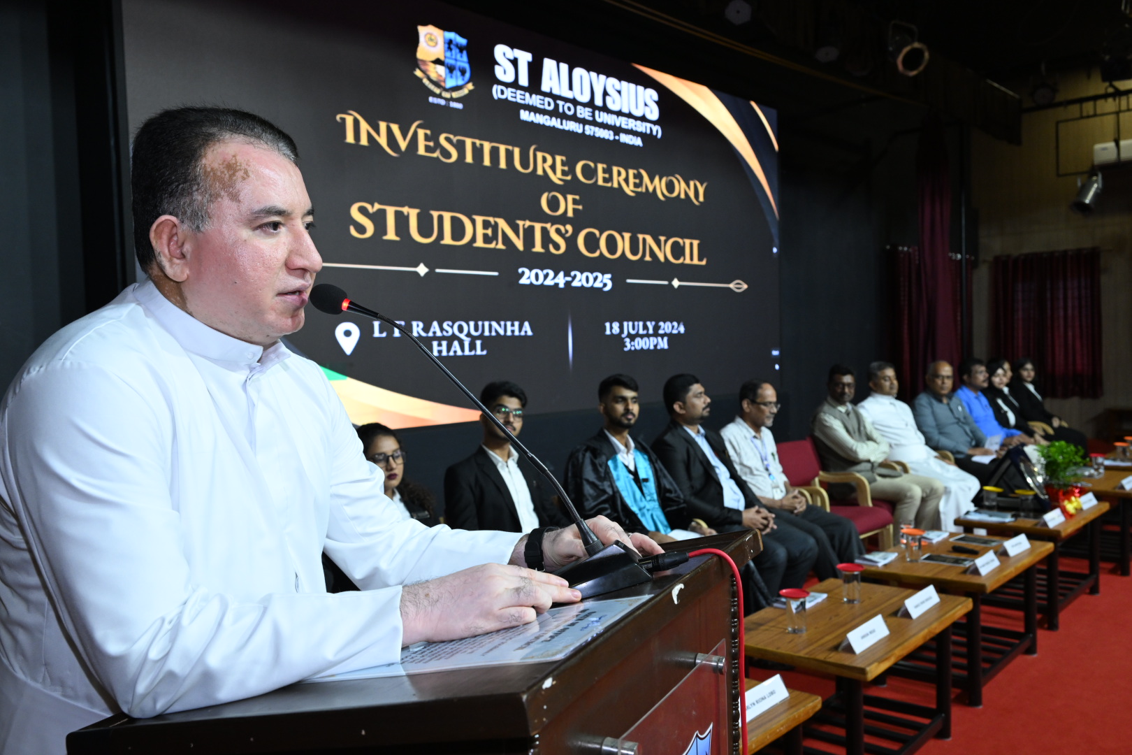 The Investiture Ceremony of the Students’ Council 2024-25 of St Aloysius (Deemed to be University), Mangaluru was held on 18th July 2024 in the L F Rasquinha Hall of LCRI Block.